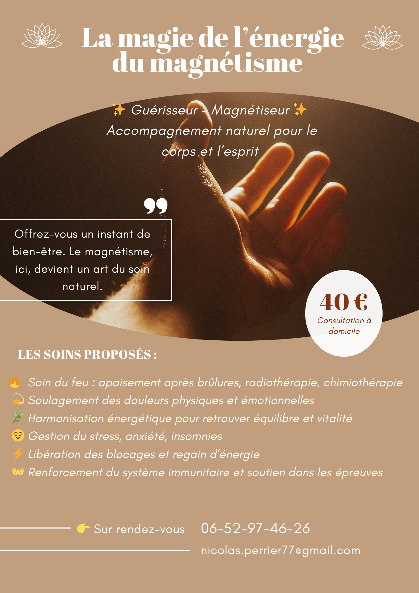 Chaque séance est unique : je me connecte à votre énergie pour libérer les blocages, apaiser les douleurs et favoriser la réharmonisation intérieure.