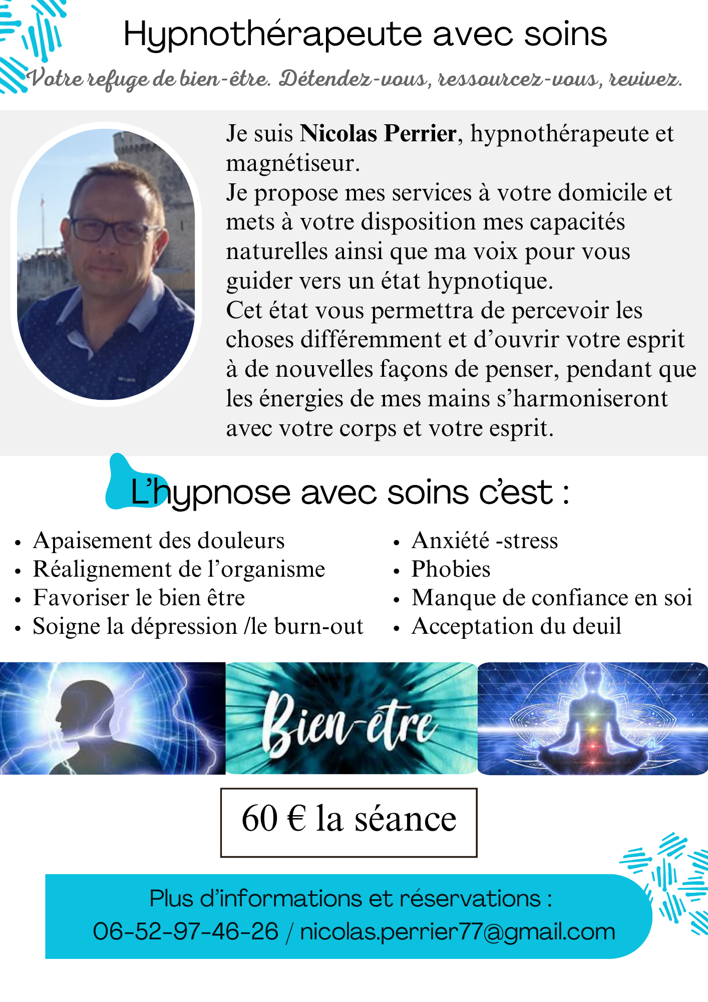Avec bienveillance et écoute, j’allie hypnose et magnétisme pour vous aider à apaiser vos douleurs, libérer vos blocages et retrouver votre